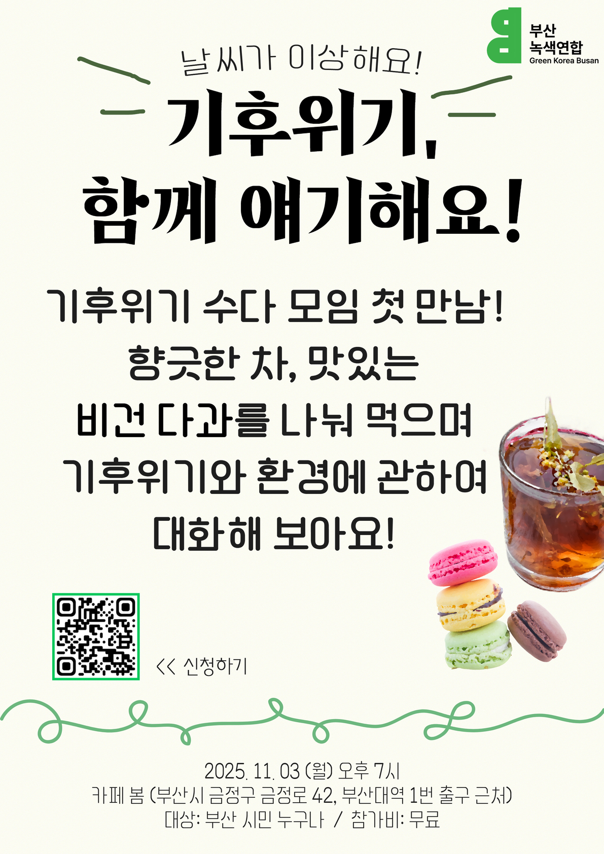 부담 없이 오셔서 향긋한 차와 맛있는 비건 다과를 나누며 기후위기와 환경에 관해, 또는 비거니즘과 동물권, 기후정의, 생물 다양성 등